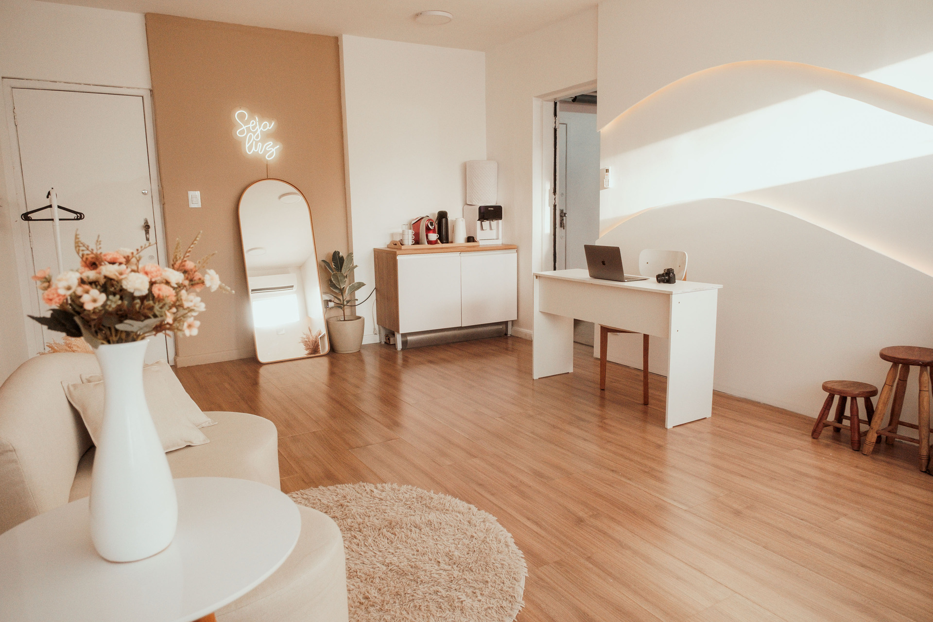 Cenário clean e moderno que simula um local de atendimento. Foco em luz natural com leveza e aconchego.